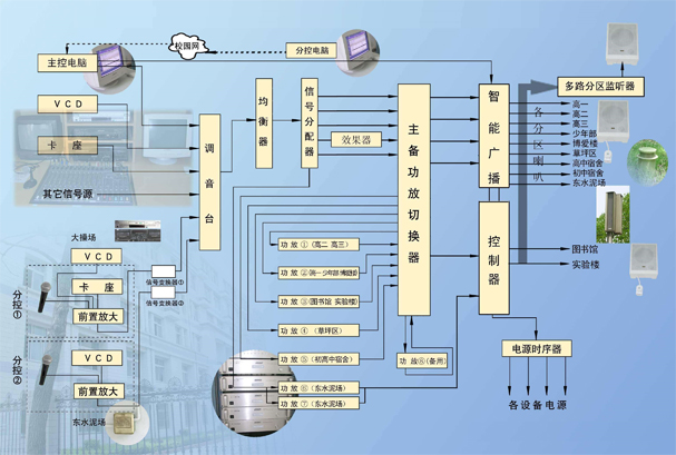针对校园广播扩声需求,采用16路电源时序器、前置放大器、数码编程控制器、室外广播音柱搭配有线麦克风等设备组成,具备作息时间音乐打铃,日常音乐播放,远程广播会议等功能,全天候定时自动编程,实现整体的无人值守智能广播。