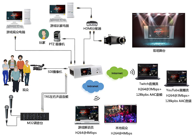 设置了四个高清频道:两个使用RTMP推送流到Twitch和YouTube的信号,而另外两个则是通过LAN直接连接到游戏解说员和本地观众。